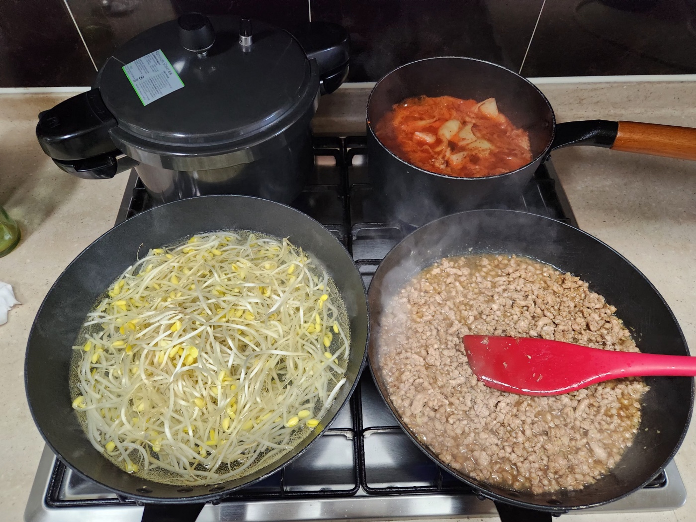 냄비에 물이랑 콩나물 넣고 끓이고