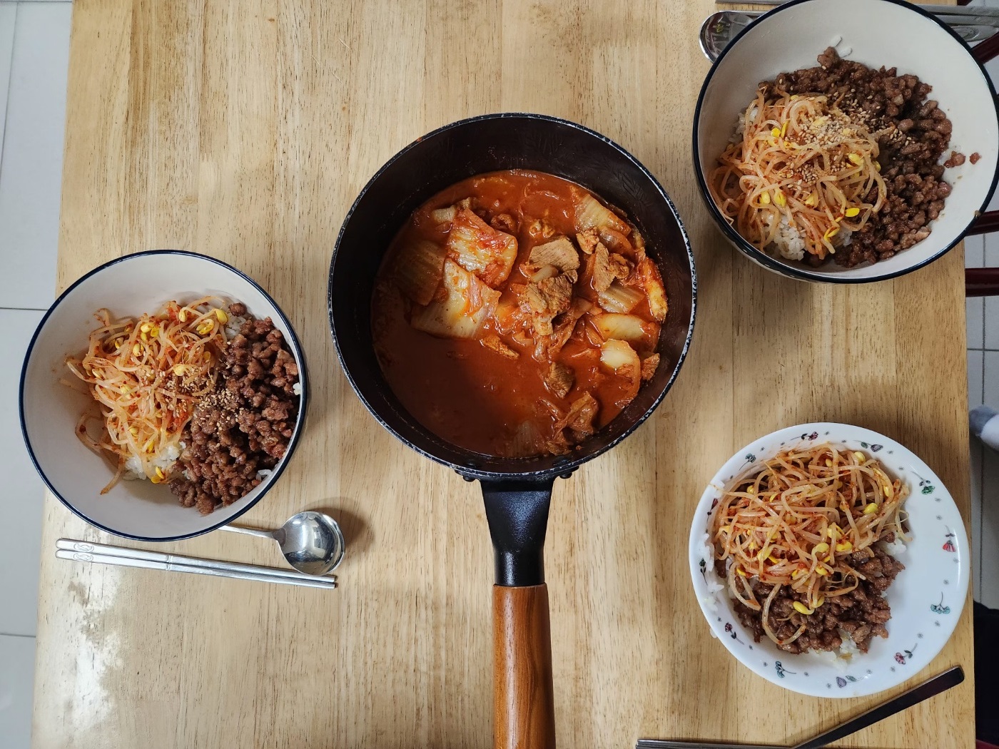 울집 두여친을 위한 저녁[목살김치찌개 콩나물고기비빔밥]